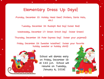 School will dismiss early on Friday, December 19th at 1:45pm. School will resume on Tuesday, January 6, 2026!